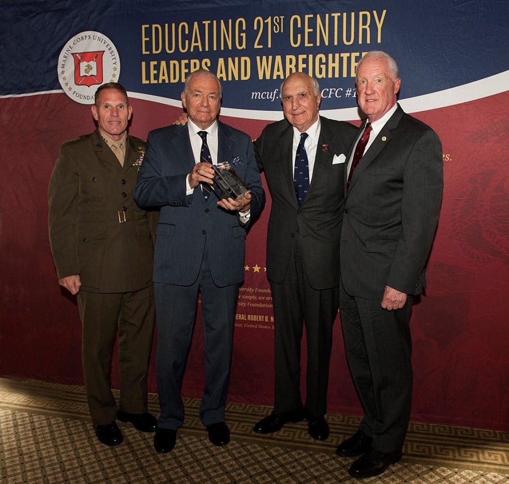 With his family by his side, to include his Marine Son, and 200 of his friends and Colleagues, Mr. Langone humbly accepted the crystal award presented by our President and CEO, Lieutenant General Richard Mills, USMC (Ret), Lunch Chairman, Mr. Guy Wyser-Pratte, and Military Guest of Honor, Lieutenant General Robert Walsh, USMC. School of MCWAR and their Marine and International Military Students were present and many former and retired Marines and Sister Services.